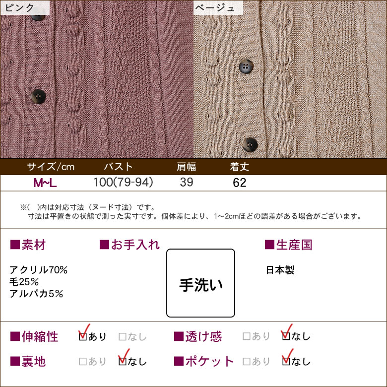 (素材)アクリル70% 毛25% アルパカ5%(カラー展開)ベージュ・ピンク(生産国)日本製70代80代の方のためのおしゃれなシニアファッション(ハイミセス向け)の洋服を多数取り揃えています。